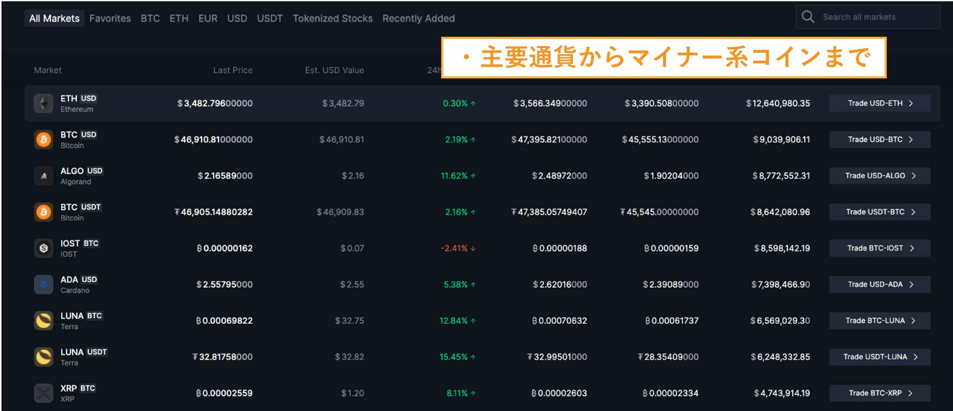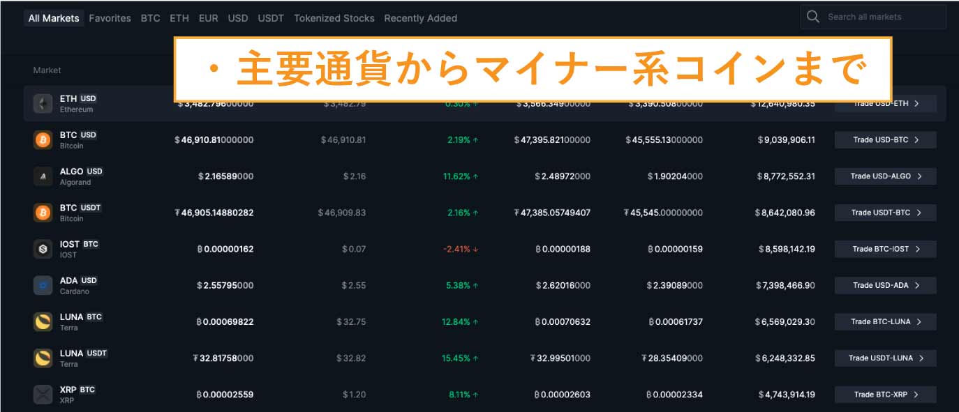 積極的に銘柄の新規上場を行う傾向もあるため、アルトコインやマイナーな草コインを投資するなら打ってつけですよ。
