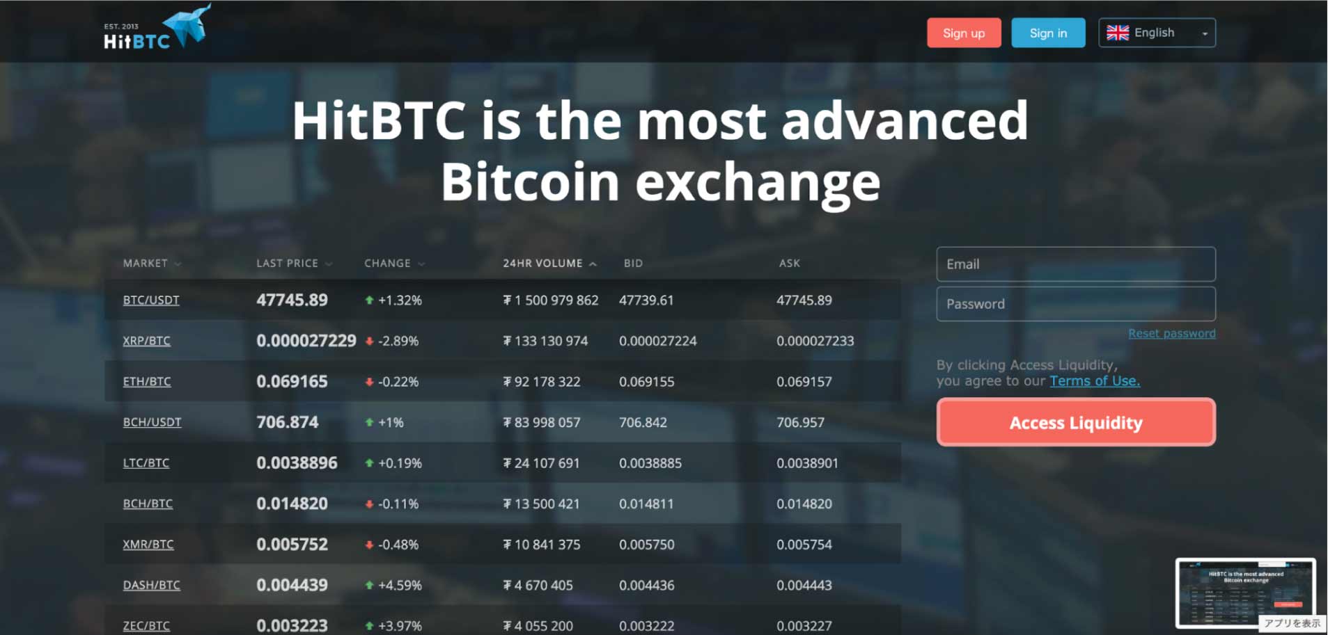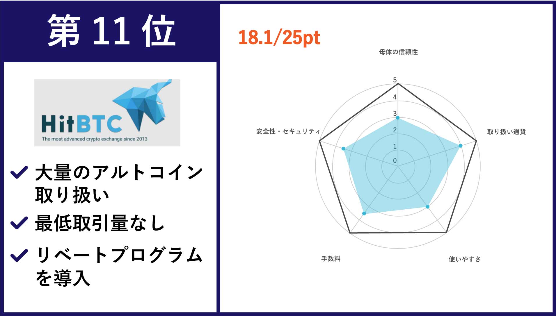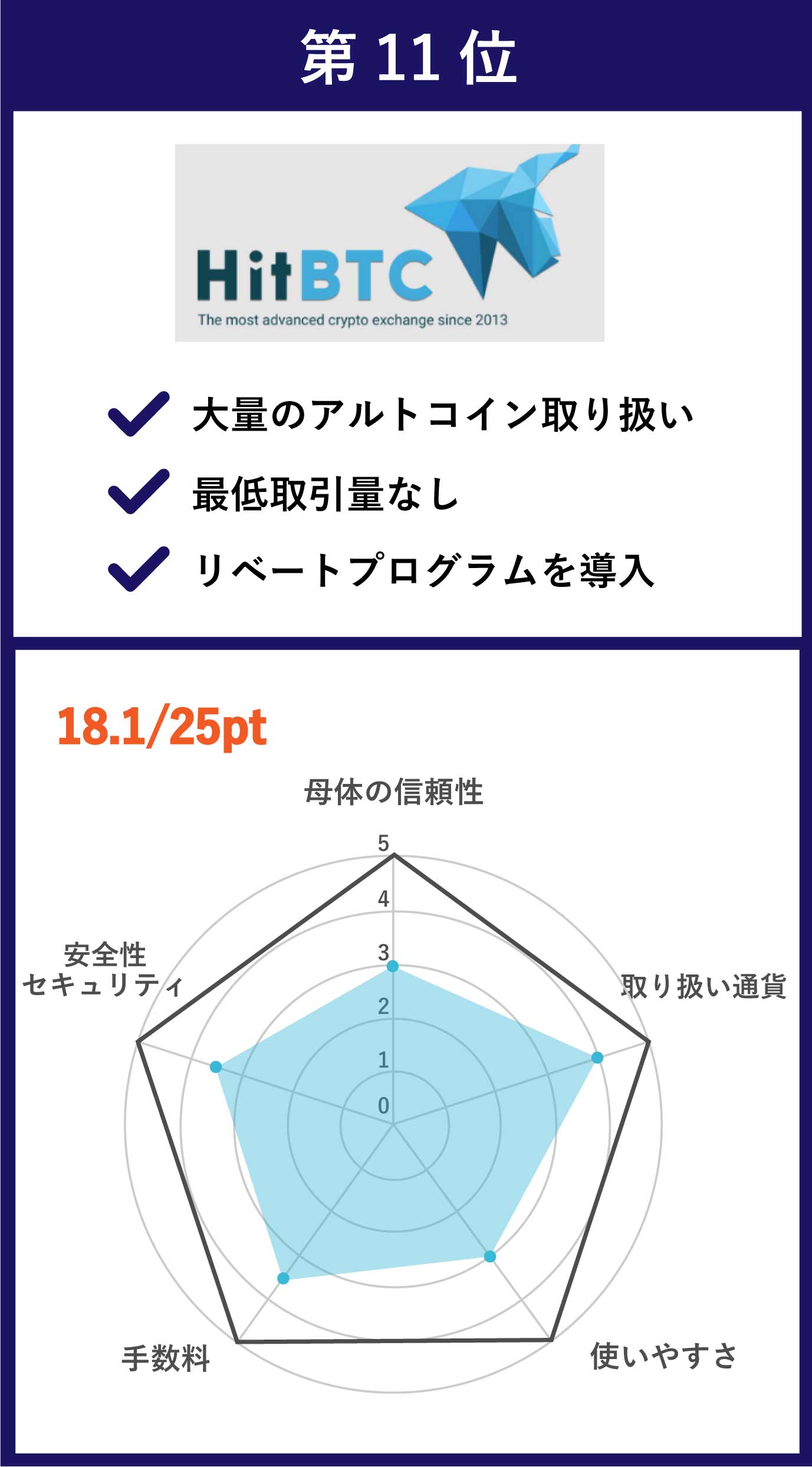 | 第11位 HitBTC | ICO銘柄からマイナーコインまで、440種類以上の取り扱い | •メイカー手数料:-0.01〜0.1% •テイカー手数料:0.055%〜0.2% |