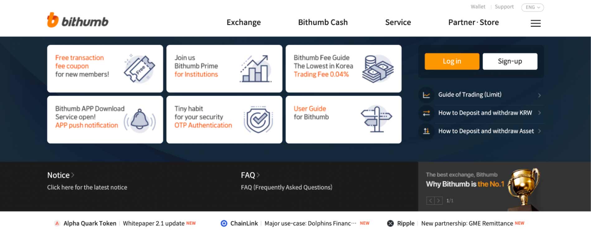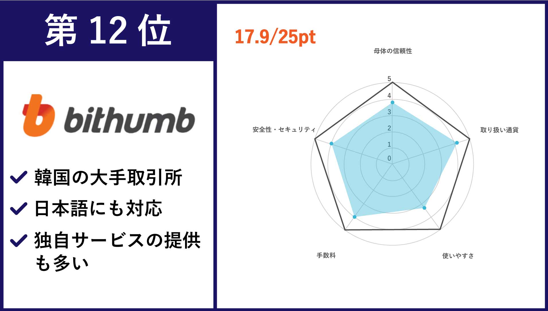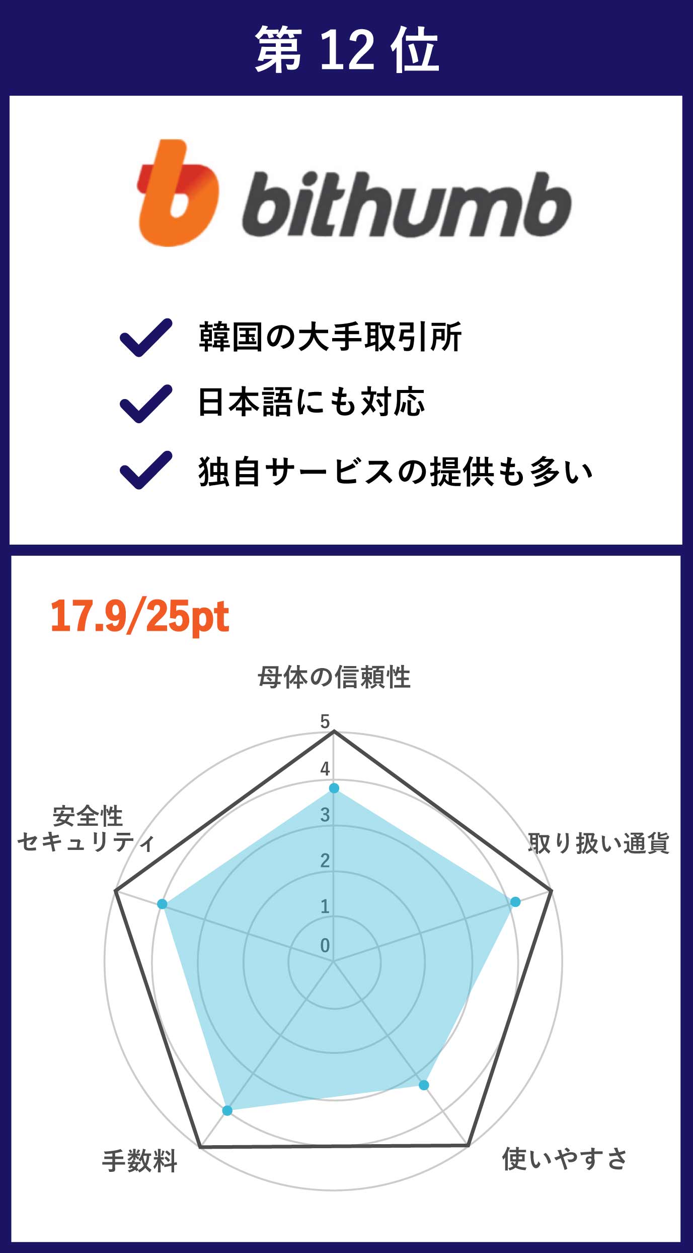 | 第12位 Bithumb | BTC/ETH/XRPなどの主要通貨、人気アルトコインからなる104種類 | 0.15% | なし |
