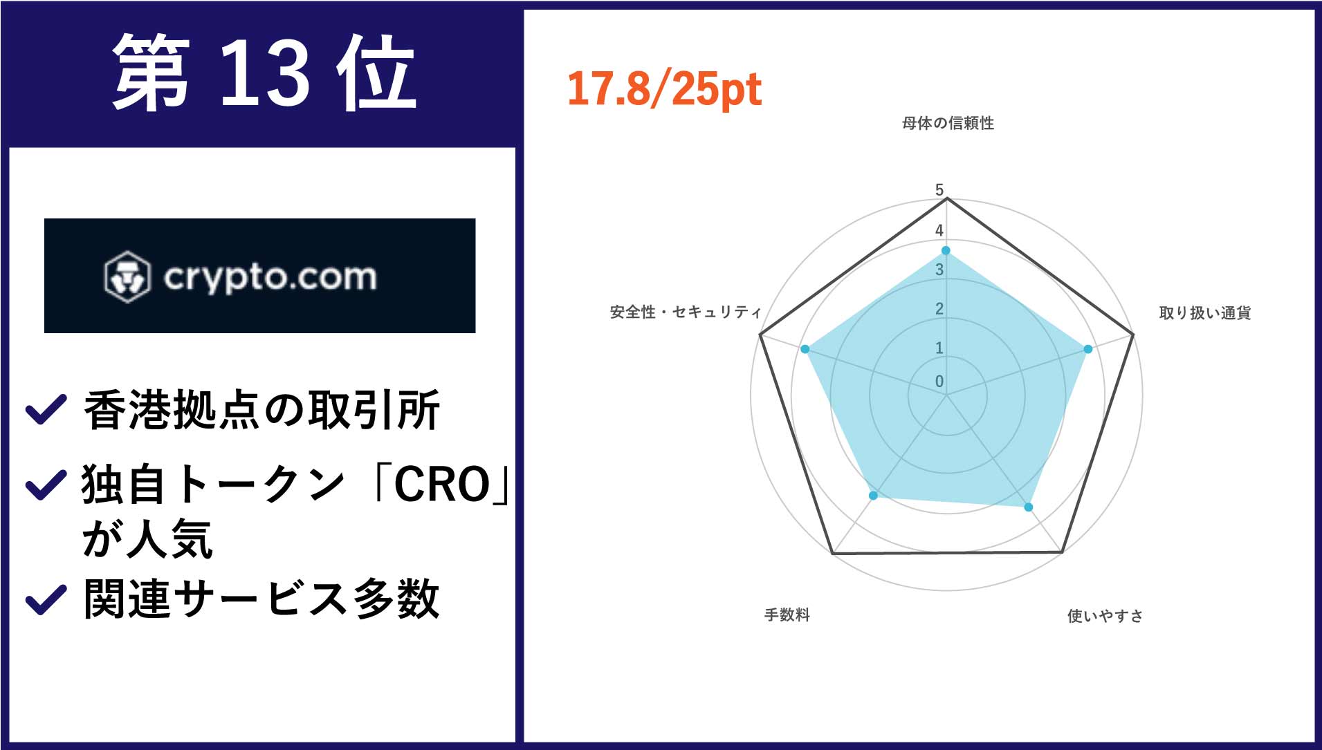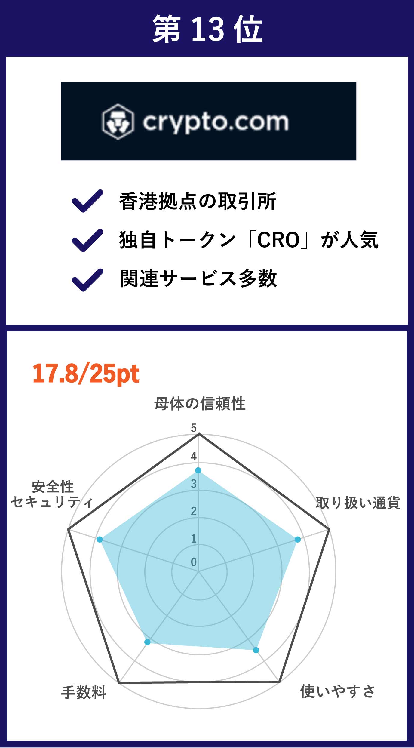 | 第13位 crypto.com | 主要通貨を含む100以上の銘柄 | •メイカー手数料:0.04〜0.2% •テイカー手数料:0.1〜0.2% |