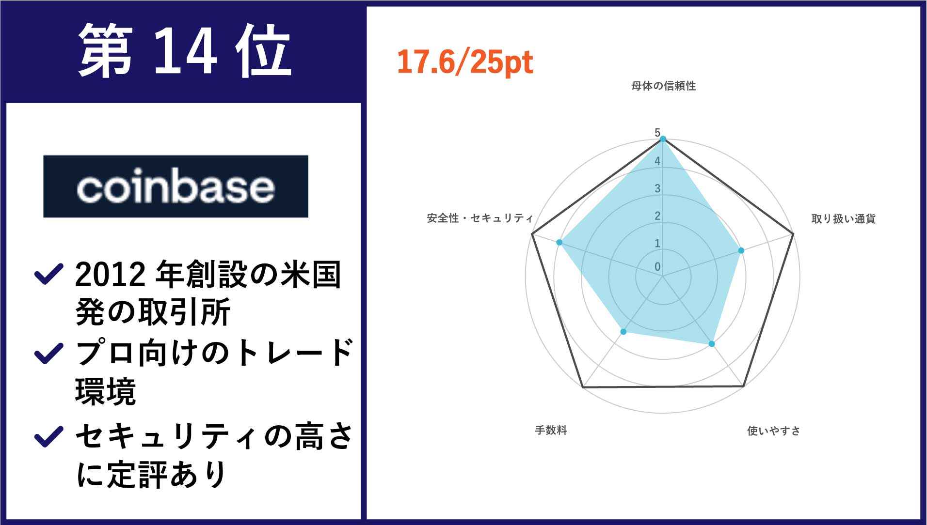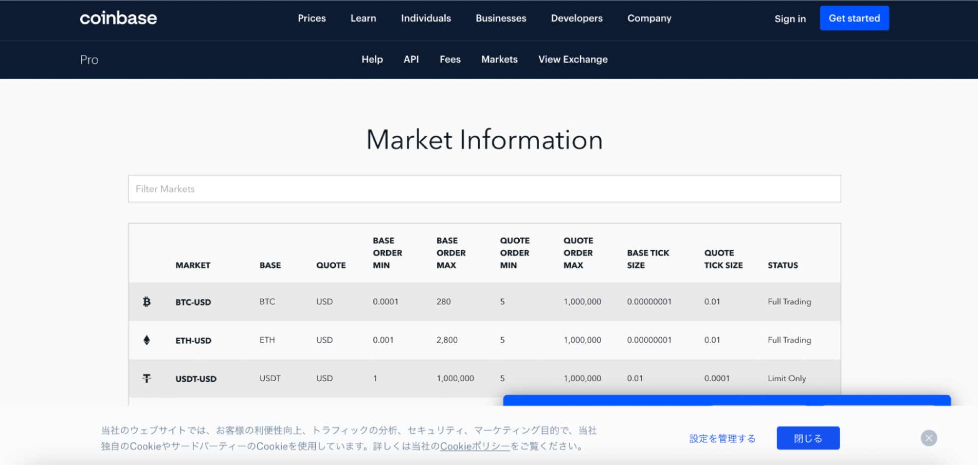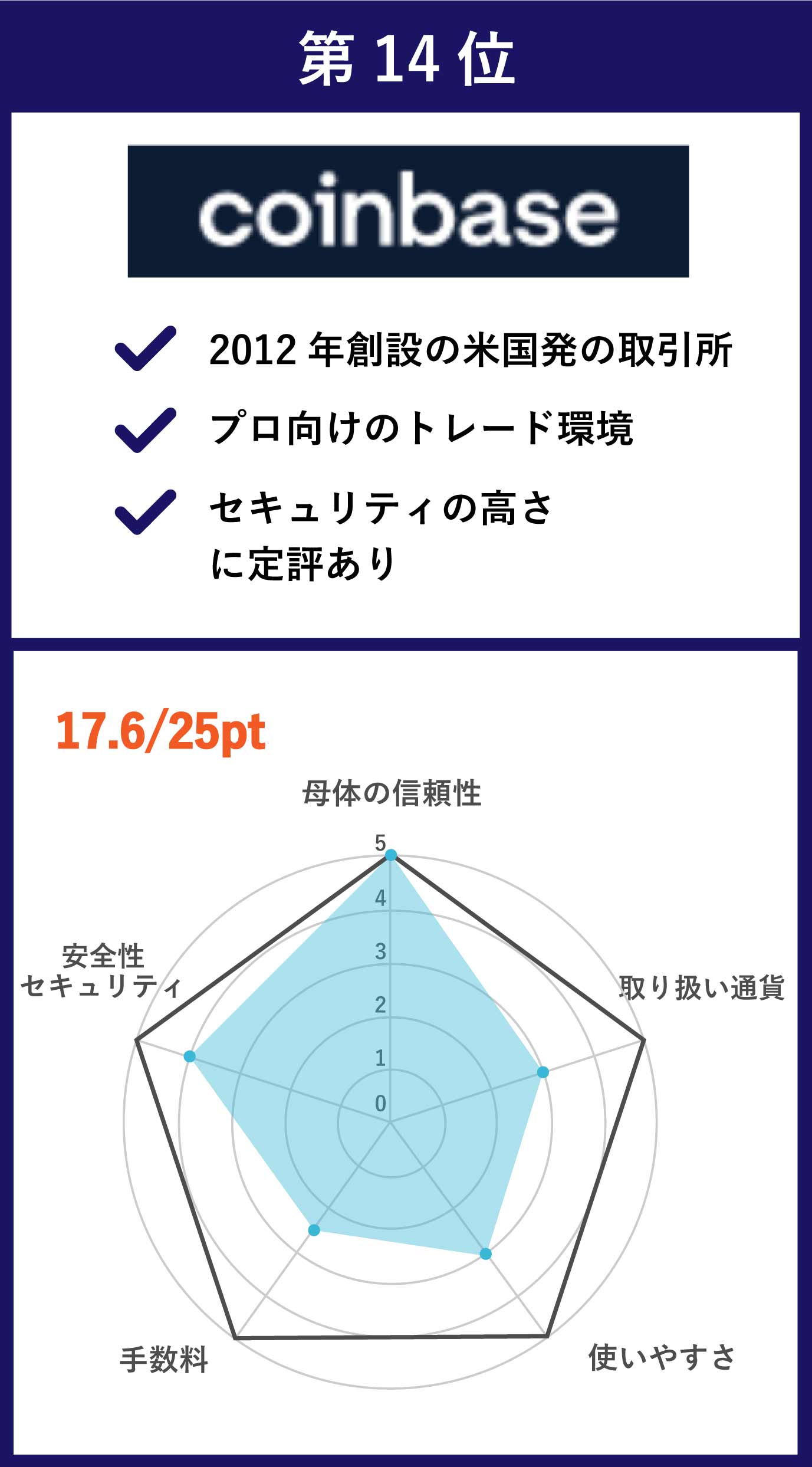 | 第14位 Coinbase pro | 主要通貨を含む29種類 | •メイカー手数料:0% •テイカー手数料:0.3% |