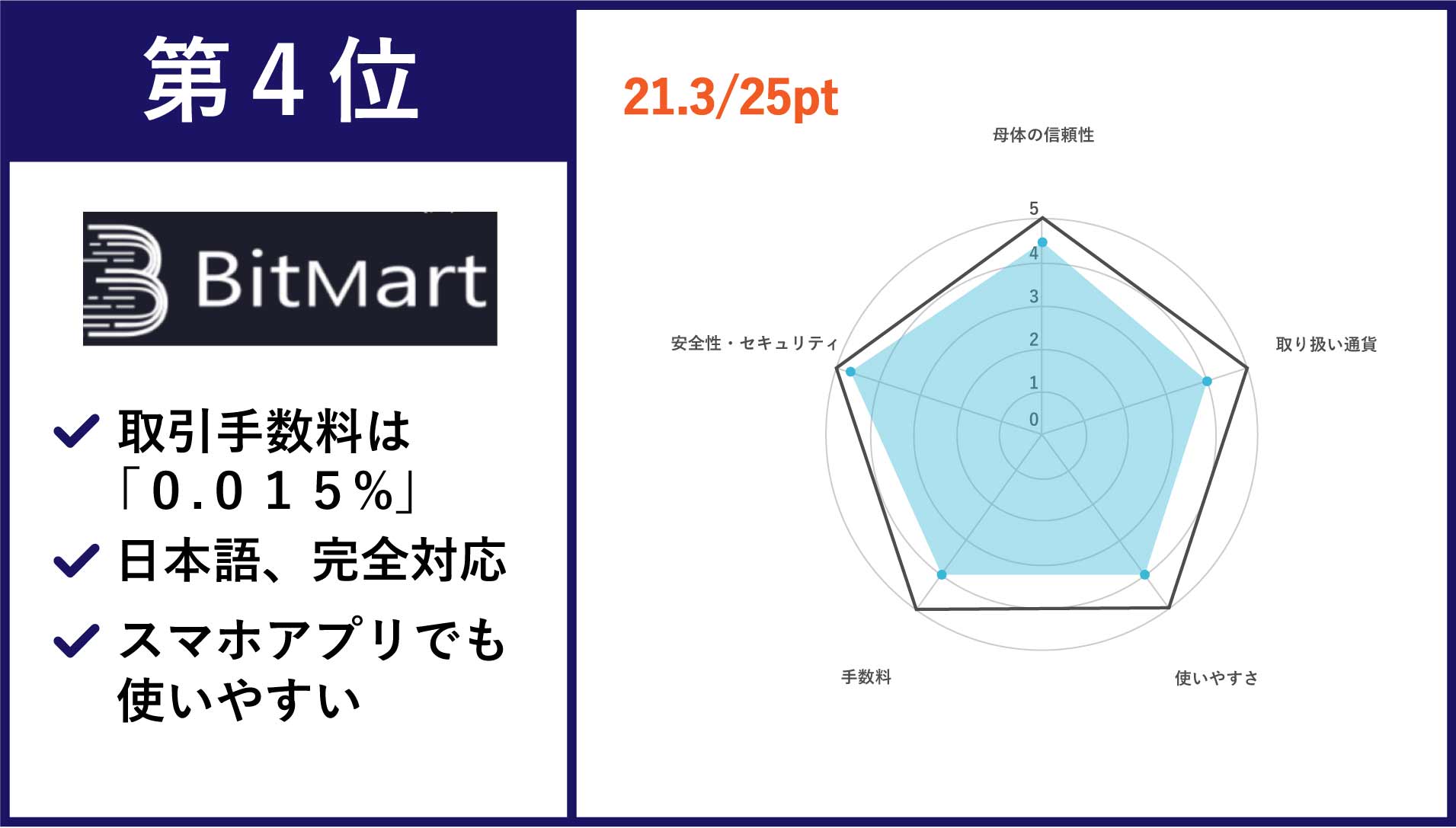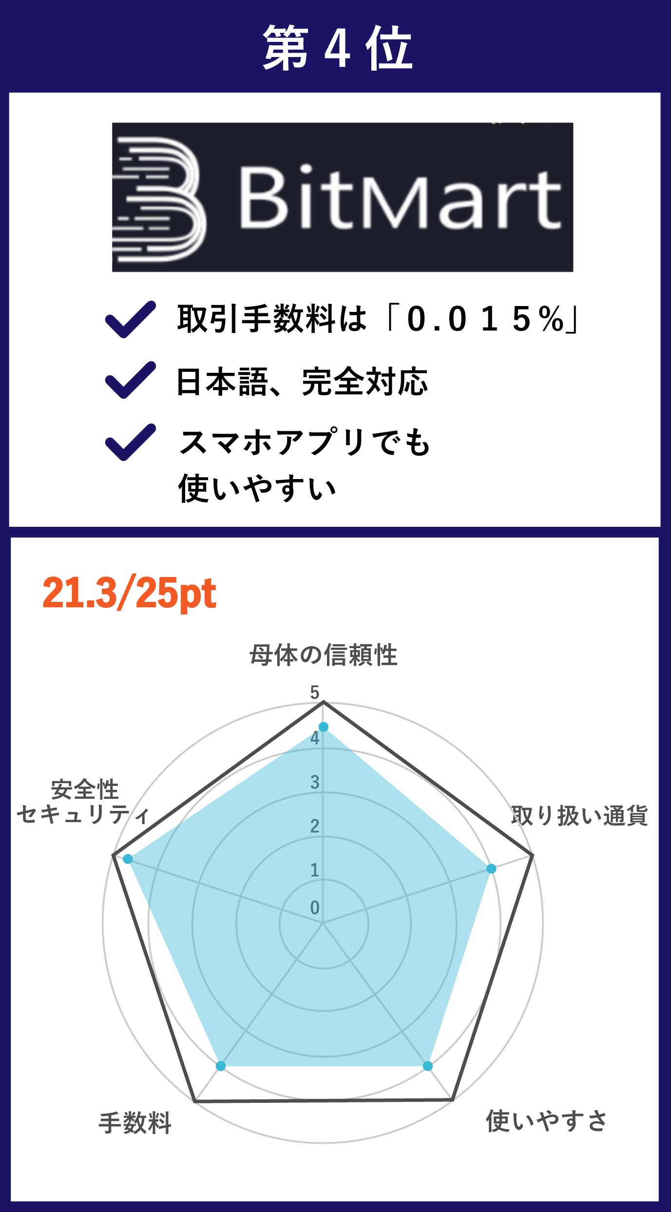 | 第4位 Bitmart | 主要通貨を含む123種類の取扱銘柄数 | •メイカー手数料:0.015〜0.25% •テイカー手数料:0.02〜0.25% |