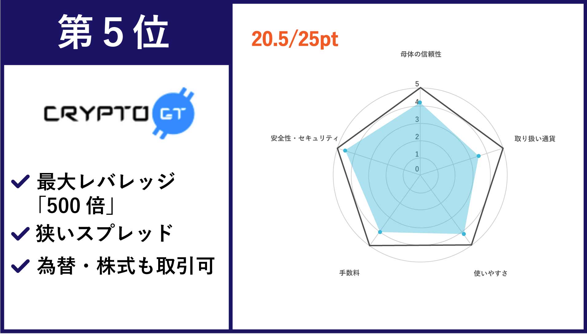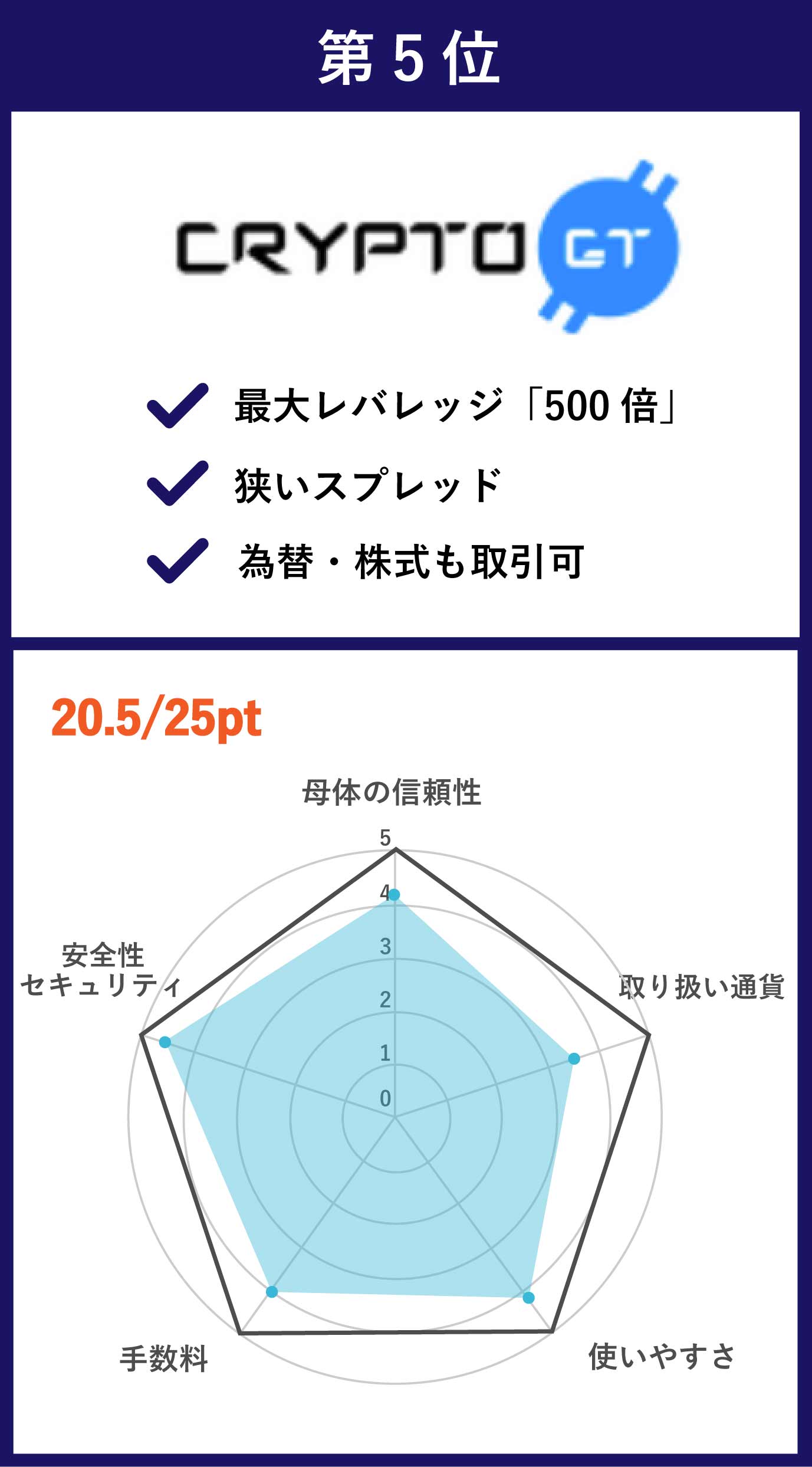 | 第5位 Crypto GT | BTC/ETH/XRPなどを含む全57種類の取扱銘柄 | 相場変動に応じたスプレッド手数料のみ(目安:0.1〜0.6%) | あり |