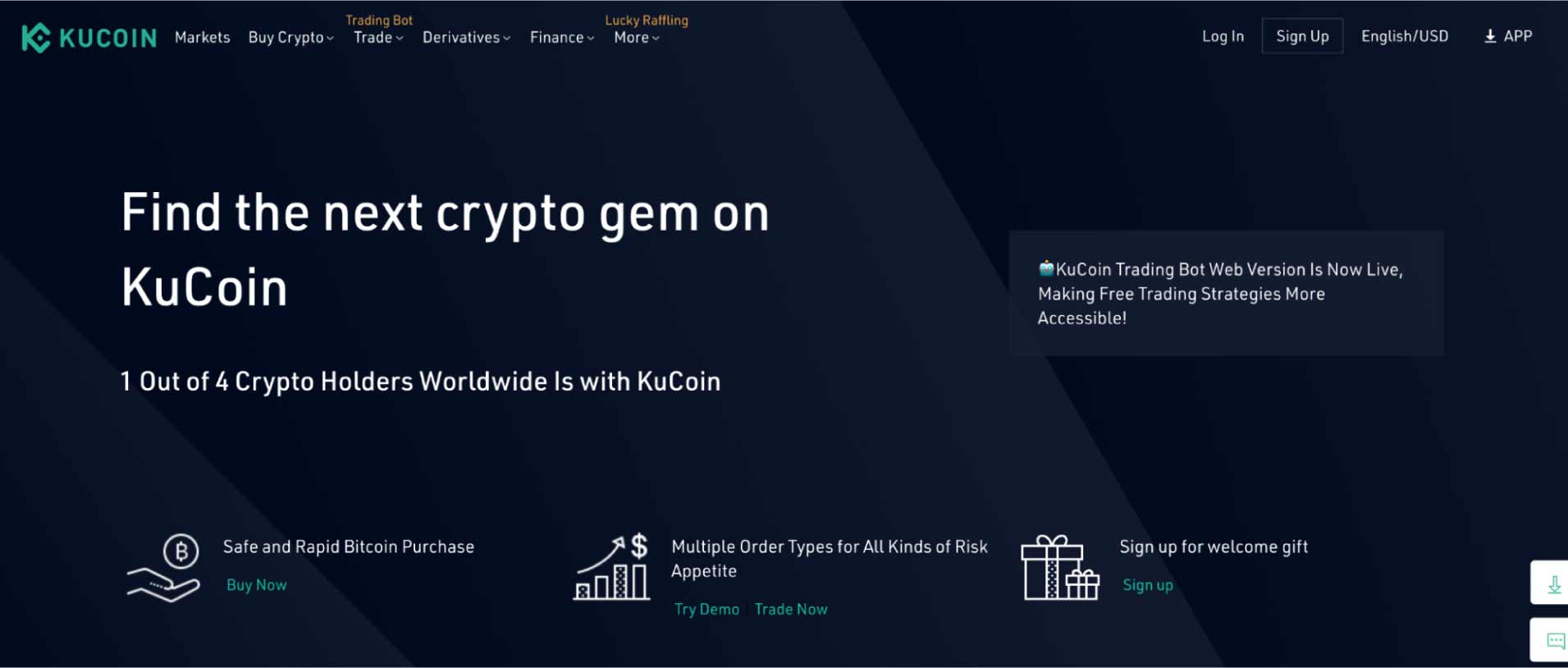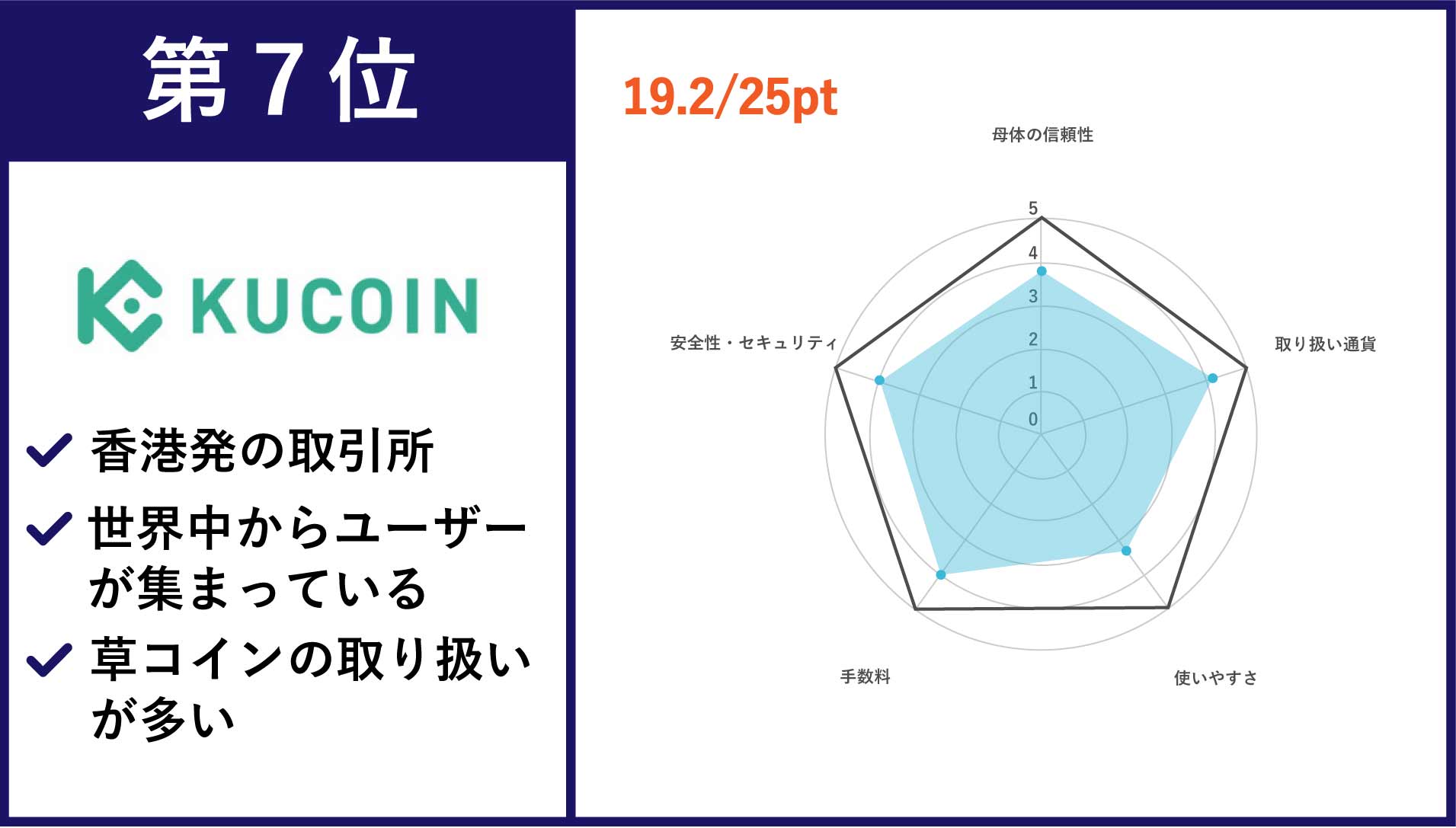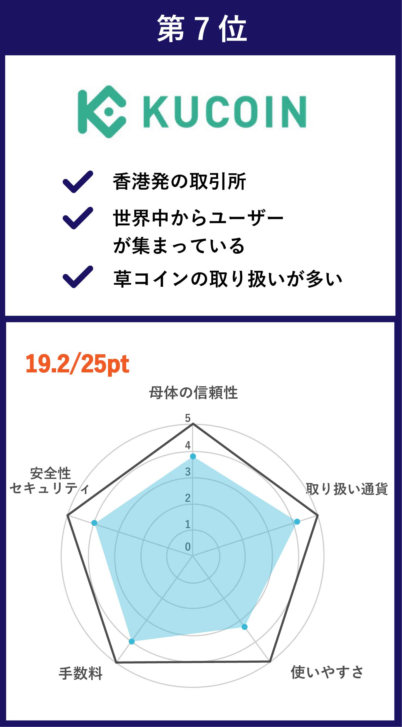 | 第7位 KuCoin | 主要通貨からマイナーコインまで、取扱銘柄数は「200」以上 | 0.1% | なし |