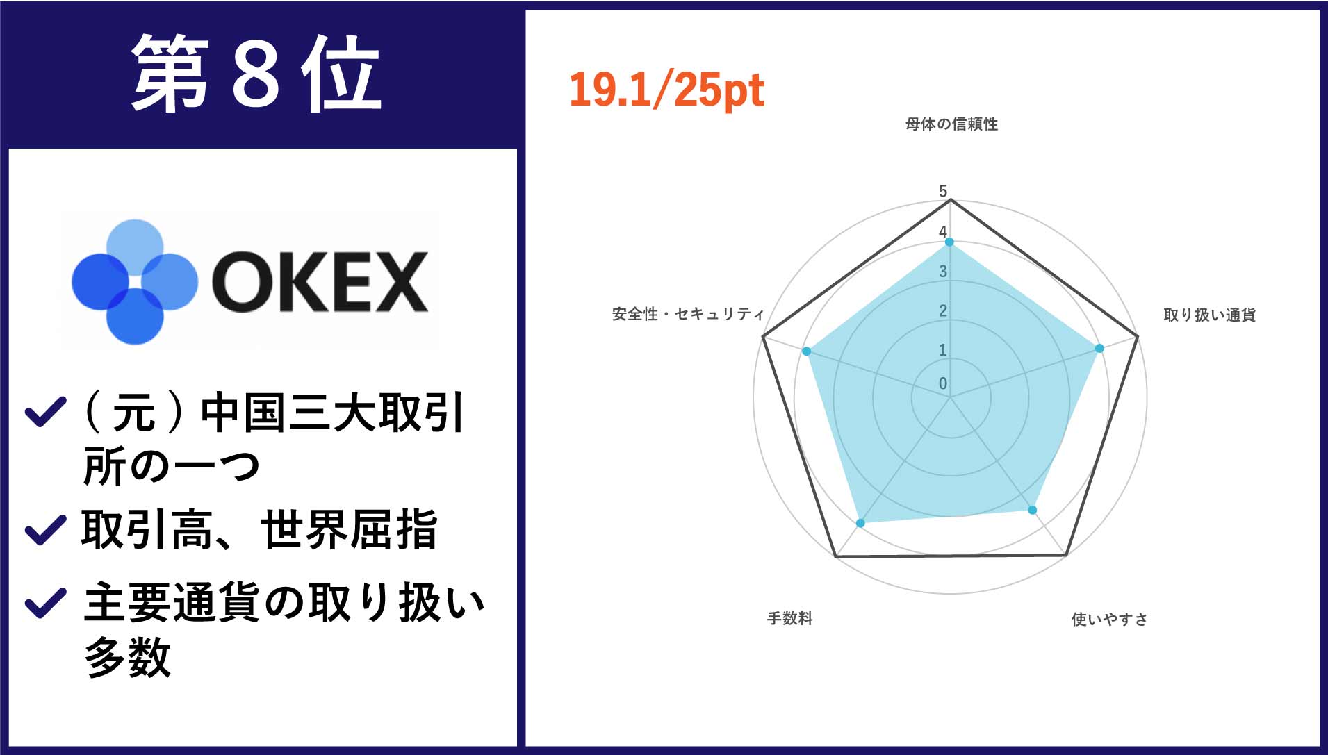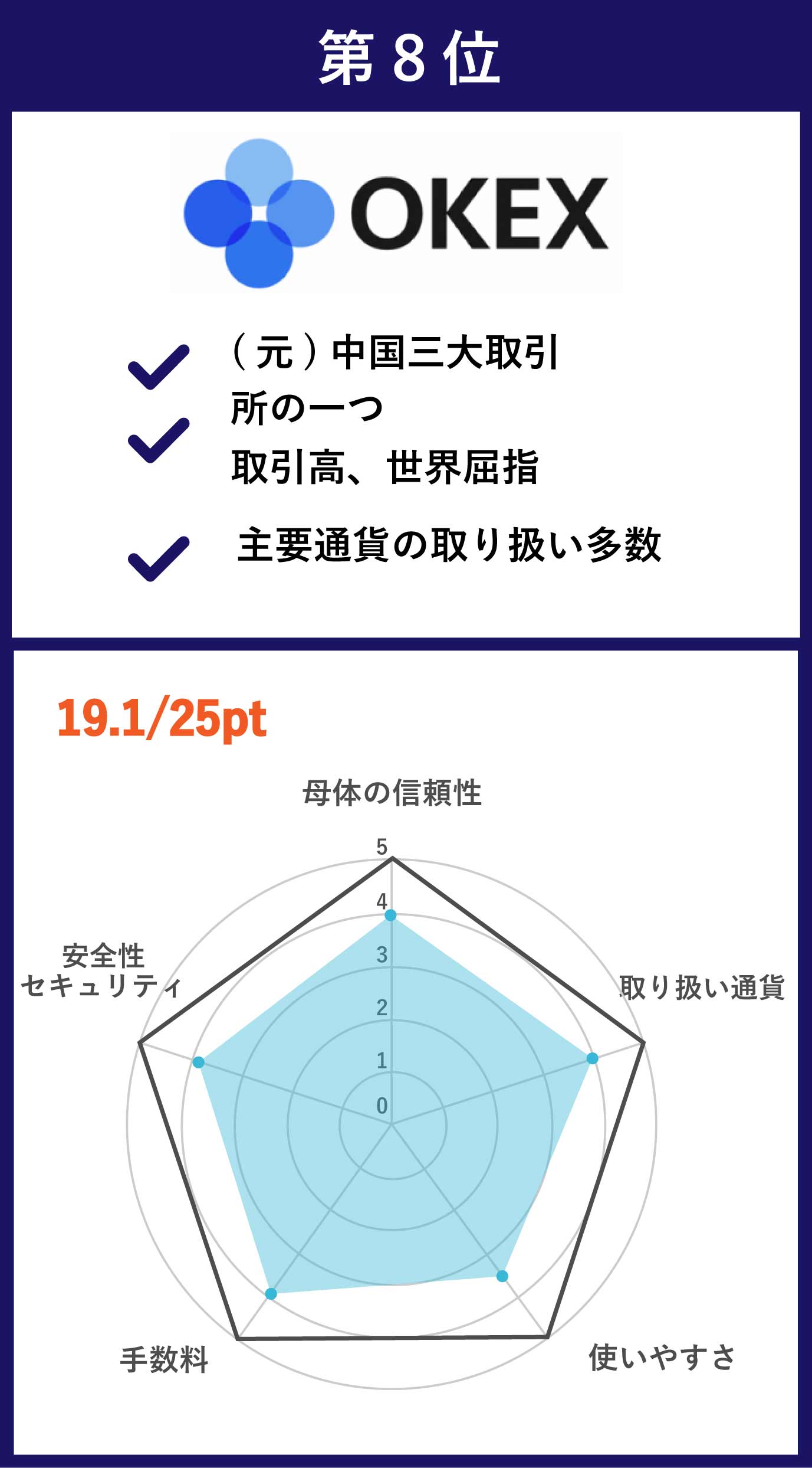 | 第8位 OKEx | 主要通貨をはじめ、150種類以上の銘柄数 | •メイカー手数料:0.1% •テイカー手数料:0.15% |
