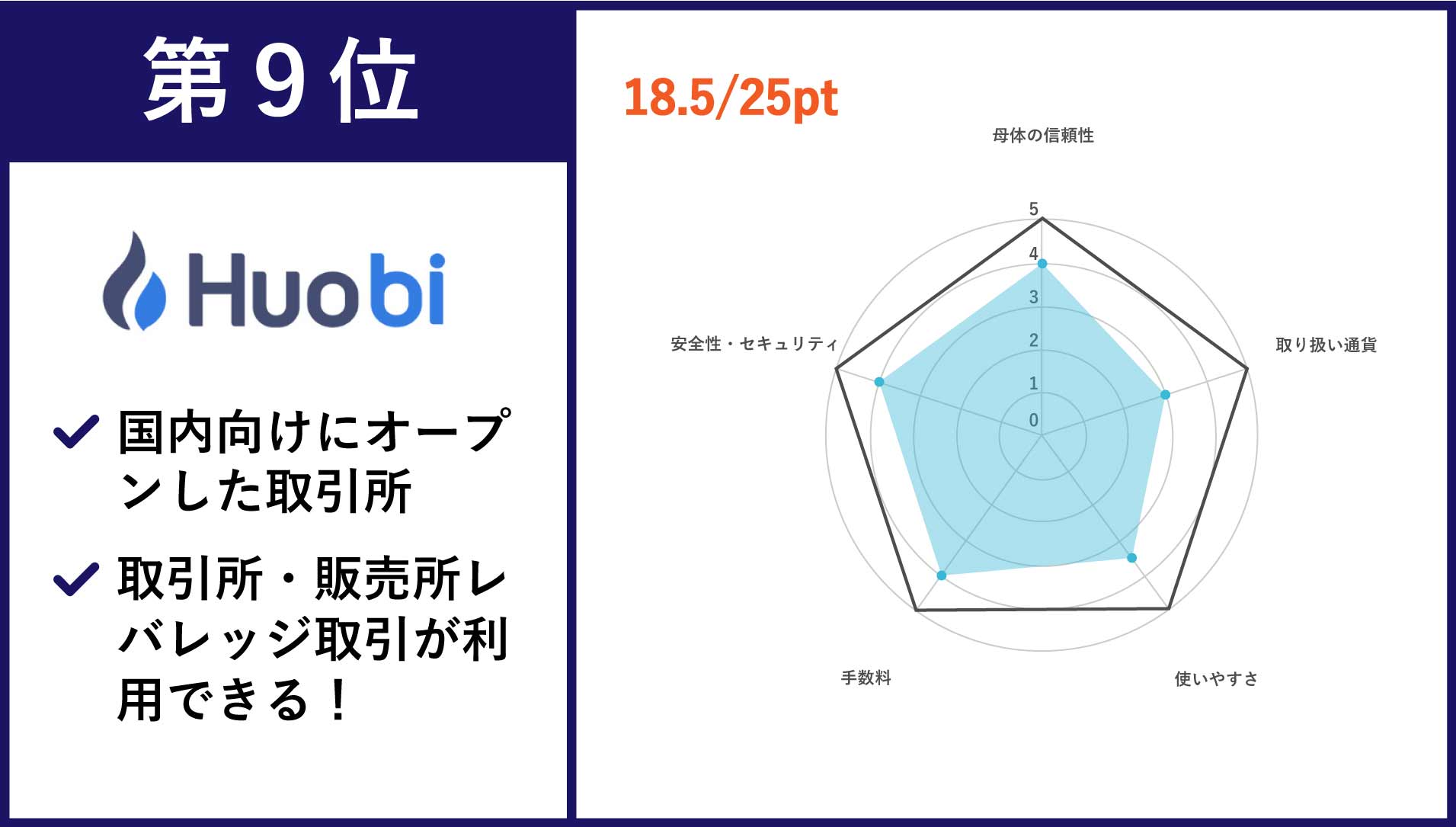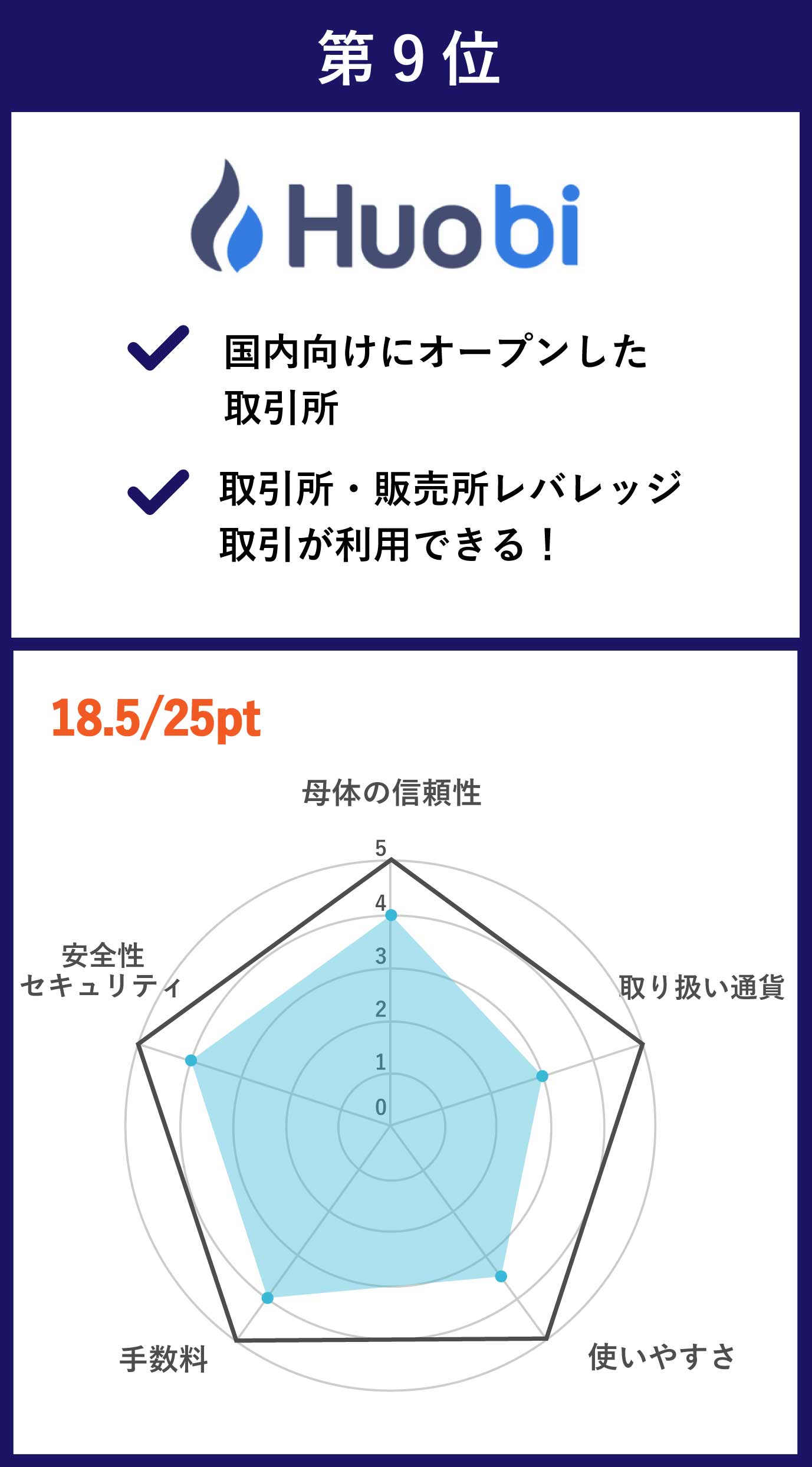| 第9位 Huobi(Japan) | BTC/ETH/XRP/BCH/LTC/XLM/XEM/BAT/ONT/MONA/HT/ETC | 無料 | あり |