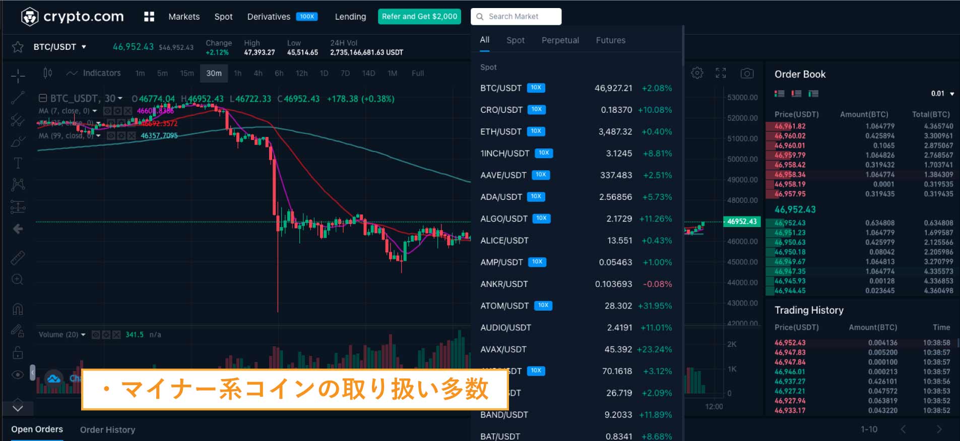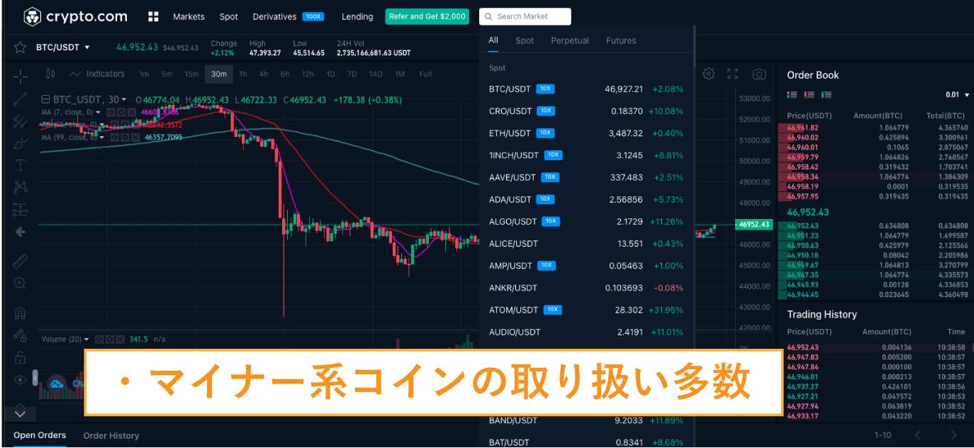 | 取扱銘柄 | BTC/ETH/BNB/ADA/DOGE/XRP/DOT/SUSHI/BCH/LTC/XEM/EOS/MATI/ETC/LINK/FILUU/AAVEU/XTZUSDTなど、20種類 |
