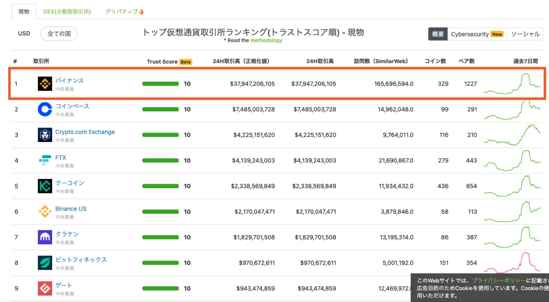 下記画像は、現物取引での取引高ランキング。