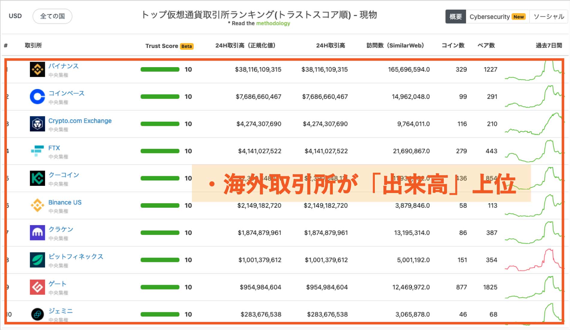 海外取引所は、世界中のユーザーが集まっており、必然的に取引高がトップクラスの取引所だらけ。