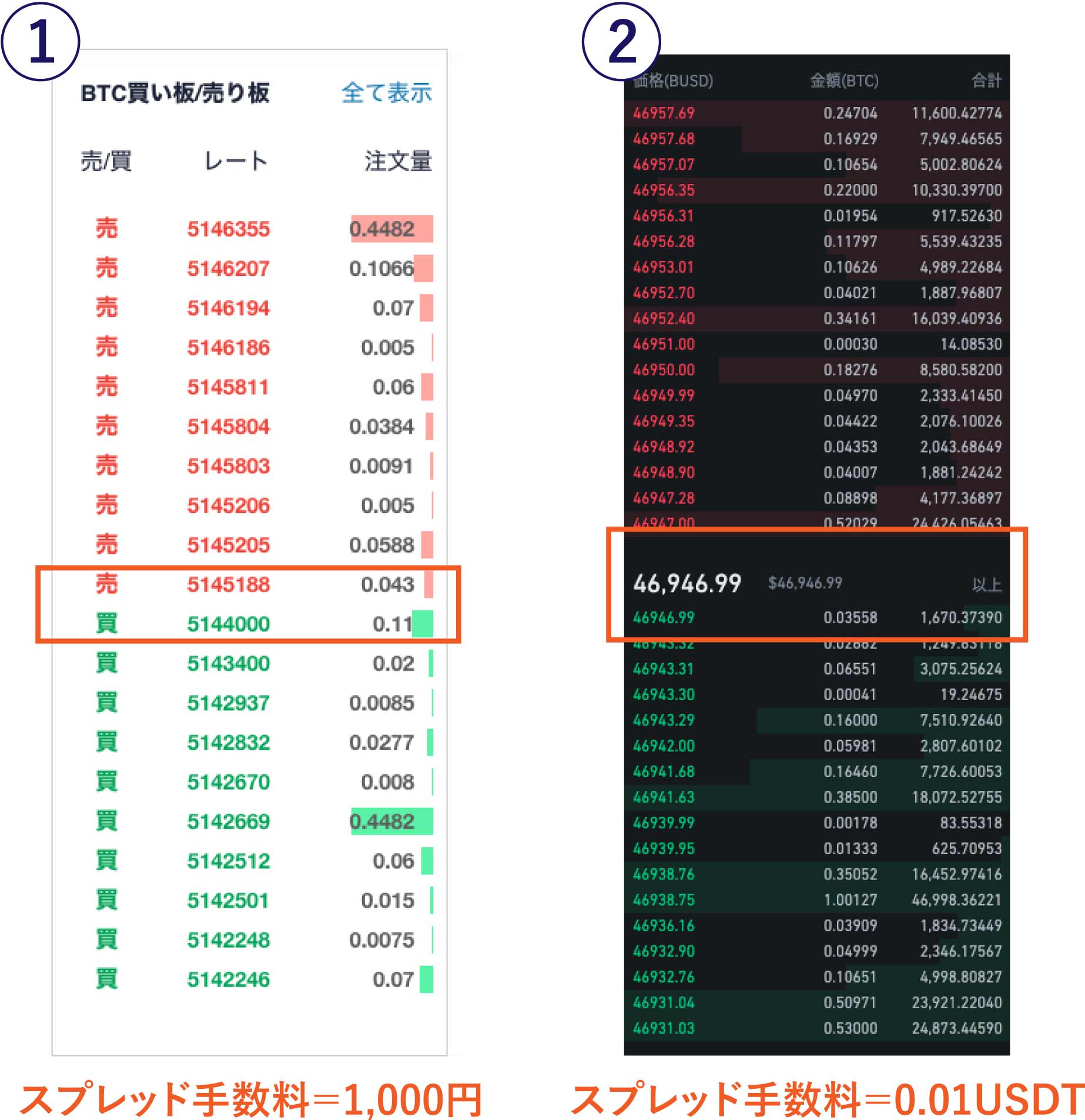 他方、②画像はBinanceでの取引板(BTC/USDT)。