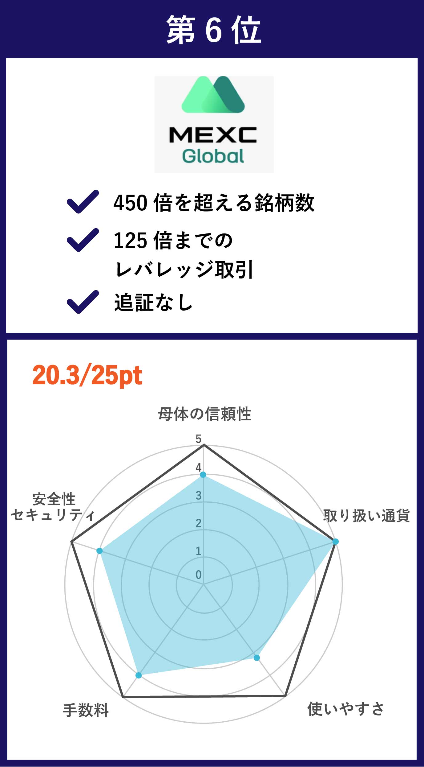 | 第6位 MEXC | デリバティブ銘柄を中心とした450以上の銘柄数 | 0.2% | あり |